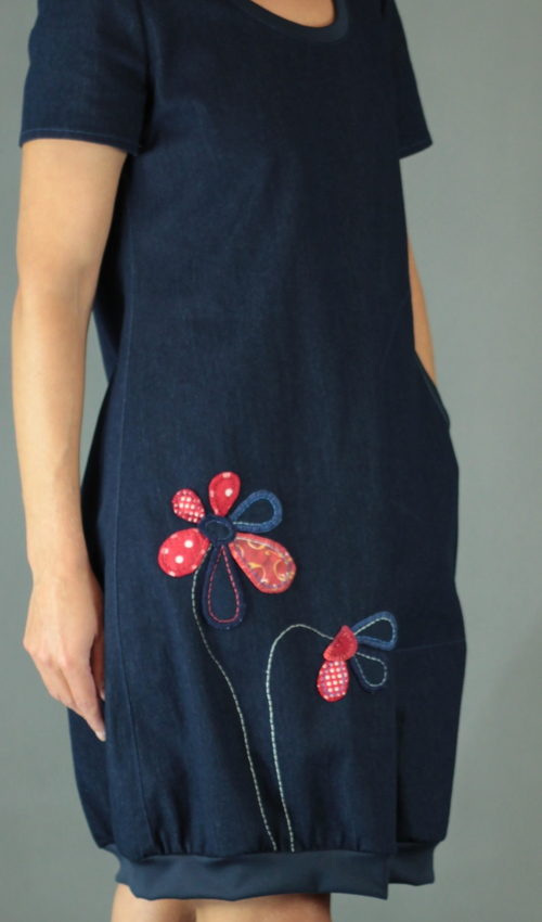 Das Kleid ist aus dehnbarem, dunkel blauem Jeansstoff hergestellt.